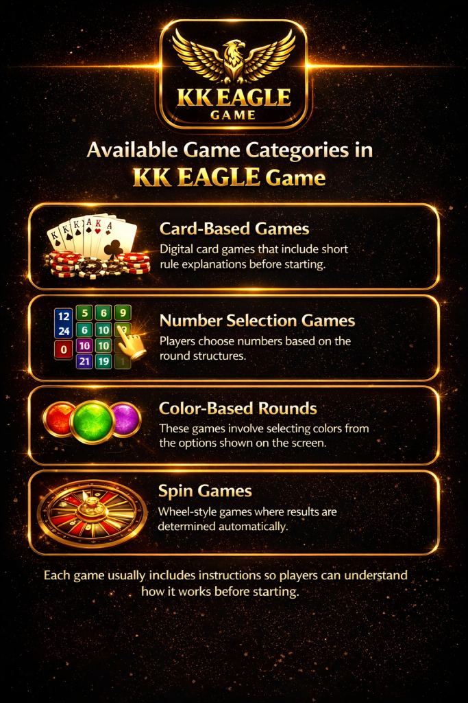 kkeagle Game is an online earning platform that offers multiple gaming categories including slot games, card games, sports betting, fishing games, and lottery options. The platform allows users to play different types of games using a small balance and win real rewards depending on their gameplay. It is designed to be simple so that even beginners can understand it easily.